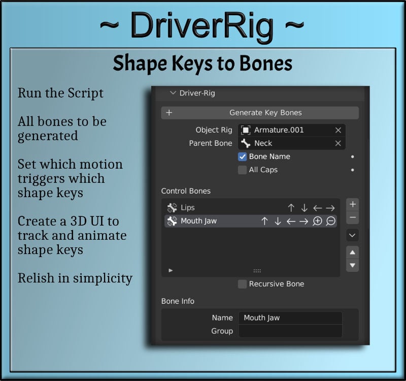 DriverRig is a simple, a necessary tool that can tame this big problem and remove all the wasted time that usually takes for manually setting these shape keys to be driven by bones.