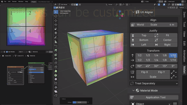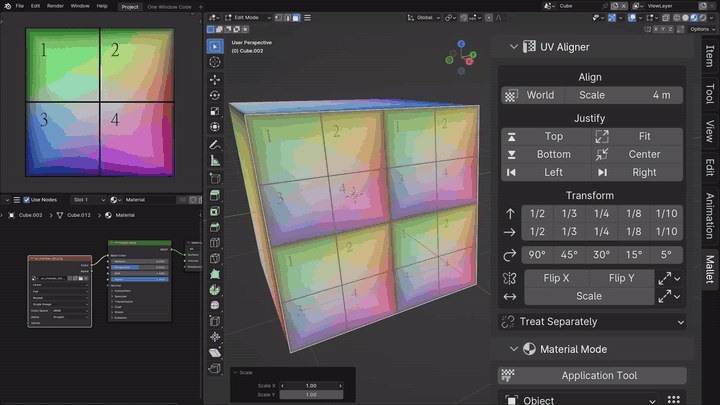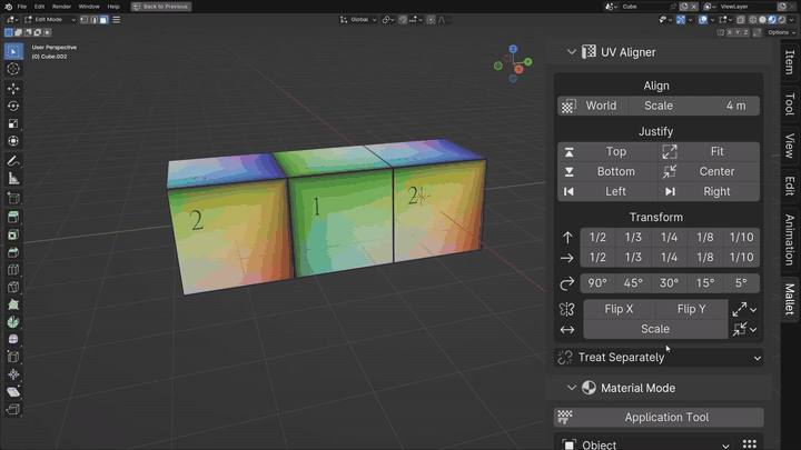 For comprehensive UV adjustments, consider integrating UV Aligner with Material Mode, an addon designed to facilitate texture application directly in the viewport - https://inlet.gumroad.com/l/mallet-material-mode