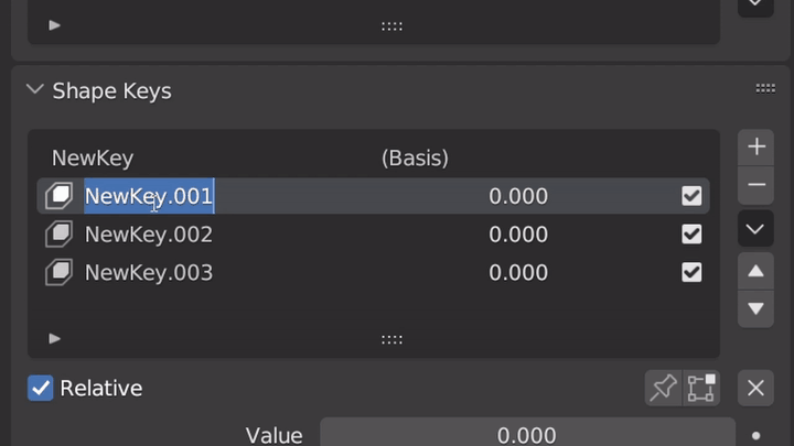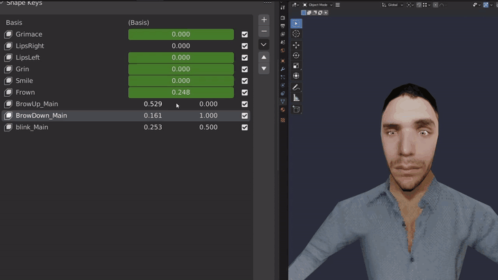 Put together up to three shape keys and display each value in one place. This allows you to group related shape keys for easier management and control over your mesh. An example would be the left and right eyebrow as shape key 1 and 2, while the 3-rd would be both of them together.