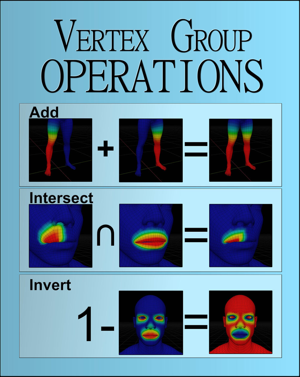 - Add merges two vertex groups by summing the weights of each vertex, allowing for stacked influences.